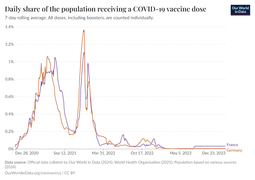 Official data collated by Our World in Data (2024); World Health Organisation (2025); Population based on various sources (2024) – with major processing by Our World in Data. “Daily share of the population receiving a COVID-19 vaccine dose” [dataset]. Official data collated by Our World in Data, “COVID-19, vaccinations”; World Health Organisation, “COVID-19, vaccinations (WHO)”; Various sources, “Population” [original data]. Retrieved December 13, 2025 from https://archive.ourworldindata.org/20250925-233948/grapher/daily-covid-vaccination-doses-per-capita.html (archived on September 25, 2025).