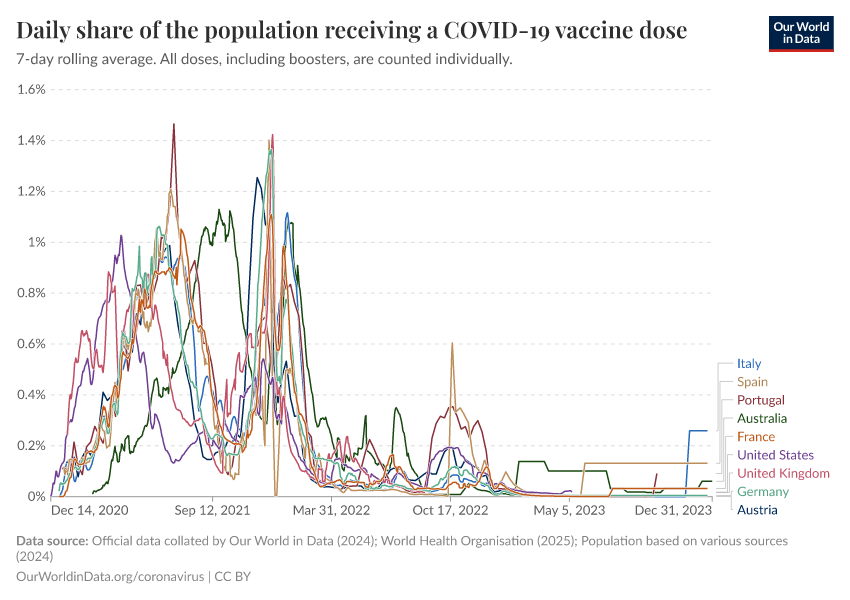 Official data collated by Our World in Data (2024); World Health Organisation (2025); Population based on various sources (2024) – with major processing by Our World in Data. “Daily share of the population receiving a COVID-19 vaccine dose” [dataset]. Official data collated by Our World in Data, “COVID-19, vaccinations”; World Health Organisation, “COVID-19, vaccinations (WHO)”; Various sources, “Population” [original data]. Retrieved December 15, 2025 from https://archive.ourworldindata.org/20250925-233948/grapher/daily-covid-vaccination-doses-per-capita.html (archived on September 25, 2025).