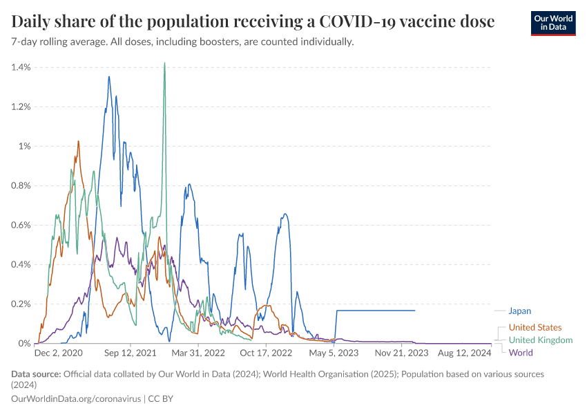 Official data collated by Our World in Data (2024); World Health Organisation (2025); Population based on various sources (2024) – with major processing by Our World in Data. “Daily share of the population receiving a COVID-19 vaccine dose” [dataset]. Official data collated by Our World in Data, “COVID-19, vaccinations”; World Health Organisation, “COVID-19, vaccinations (WHO)”; Various sources, “Population” [original data]. Retrieved April 24, 2026 from https://archive.ourworldindata.org/20260417-112857/grapher/daily-covid-vaccination-doses-per-capita.html (archived on April 17, 2026).Download