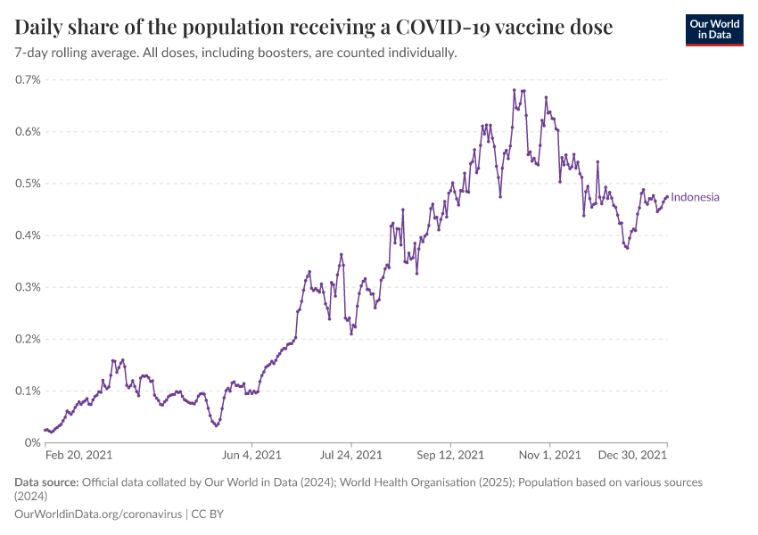 Official data collated by Our World in Data (2024); World Health Organisation (2025); Population based on various sources (2024) – with major processing by Our World in Data. “Daily share of the population receiving a COVID-19 vaccine dose” [dataset]. Official data collated by Our World in Data, “COVID-19, vaccinations”; World Health Organisation, “COVID-19, vaccinations (WHO)”; Various sources, “Population” [original data]. Retrieved January 27, 2026 from https://archive.ourworldindata.org/20260119-065148/grapher/daily-covid-vaccination-doses-per-capita.html (archived on January 19, 2026).