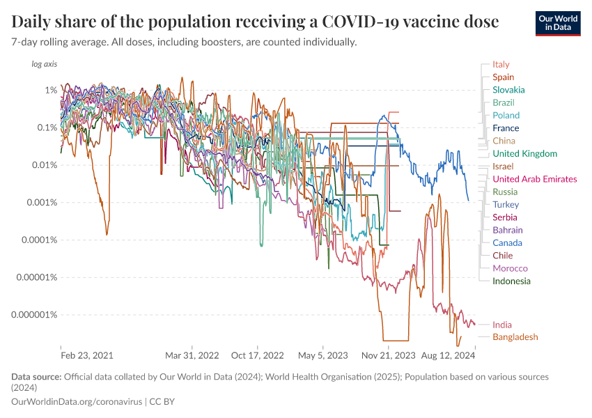 Official data collated by Our World in Data (2024); World Health Organisation (2025); Population based on various sources (2024) – with major processing by Our World in Data. “Daily share of the population receiving a COVID-19 vaccine dose” [dataset]. Official data collated by Our World in Data, “COVID-19, vaccinations”; World Health Organisation, “COVID-19, vaccinations (WHO)”; Various sources, “Population” [original data]. Retrieved December 13, 2025 from https://archive.ourworldindata.org/20250925-233948/grapher/daily-covid-vaccination-doses-per-capita.html (archived on September 25, 2025).