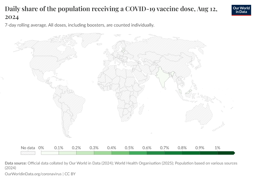 Official data collated by Our World in Data (2024); World Health Organisation (2025); Population based on various sources (2024) – with major processing by Our World in Data. “Daily share of the population receiving a COVID-19 vaccine dose” [dataset]. Official data collated by Our World in Data, “COVID-19, vaccinations”; World Health Organisation, “COVID-19, vaccinations (WHO)”; Various sources, “Population” [original data]. Retrieved December 10, 2025 from https://archive.ourworldindata.org/20250925-233948/grapher/daily-covid-vaccination-doses-per-capita.html (archived on September 25, 2025).