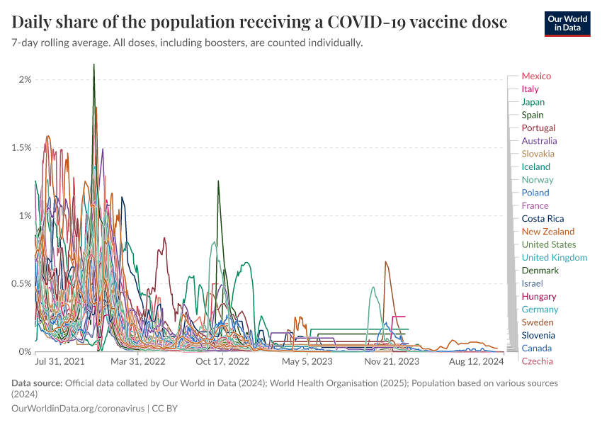 Official data collated by Our World in Data (2024); World Health Organisation (2025); Population based on various sources (2024) – with major processing by Our World in Data. “Daily share of the population receiving a COVID-19 vaccine dose” [dataset]. Official data collated by Our World in Data, “COVID-19, vaccinations”; World Health Organisation, “COVID-19, vaccinations (WHO)”; Various sources, “Population” [original data]. Retrieved March 17, 2026 from https://archive.ourworldindata.org/20260304-094028/grapher/daily-covid-vaccination-doses-per-capita.html (archived on March 4, 2026).