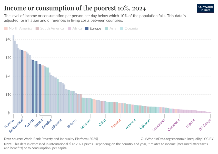 “Data Page: Income or consumption of the poorest 10%”, part of the following publication: Joe Hasell, Bertha Rohenkohl, Pablo Arriagada, Esteban Ortiz-Ospina, and Max Roser (2022) - “Poverty”. Data adapted from World Bank Poverty and Inequality Platform. Retrieved from https://archive.ourworldindata.org/20251209-133038/grapher/daily-income-or-consumption-of-the-poorest-10-marimekko.html [online resource] (archived on December 9, 2025).How to cite this data