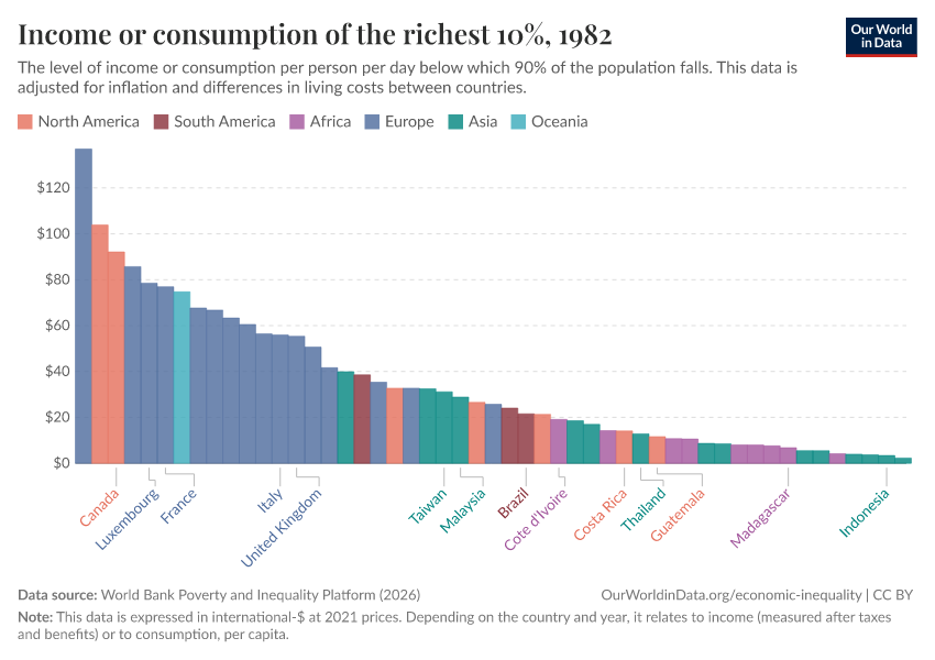 World Bank Poverty and Inequality Platform (2026) – with major processing by Our World in Data. “Income or consumption of the richest 10% – World Bank” [dataset]. World Bank Poverty and Inequality Platform, “World Bank Poverty and Inequality Platform (PIP) 20260324_2021, 20260324_2017” [original data]. Retrieved April 19, 2026 from https://archive.ourworldindata.org/20260413-090342/grapher/daily-income-or-consumption-of-the-richest-10-marimekko.html (archived on April 13, 2026).Download
