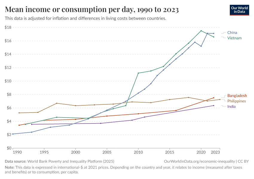 World Bank Poverty and Inequality Platform (2025) – with major processing by Our World in Data. “Mean income or consumption per day – World Bank” [dataset]. World Bank Poverty and Inequality Platform, “World Bank Poverty and Inequality Platform (PIP) 20250930_2021, 20250930_2017” [original data]. Retrieved December 23, 2025 from https://archive.ourworldindata.org/20251209-133038/grapher/daily-mean-income.html (archived on December 9, 2025).