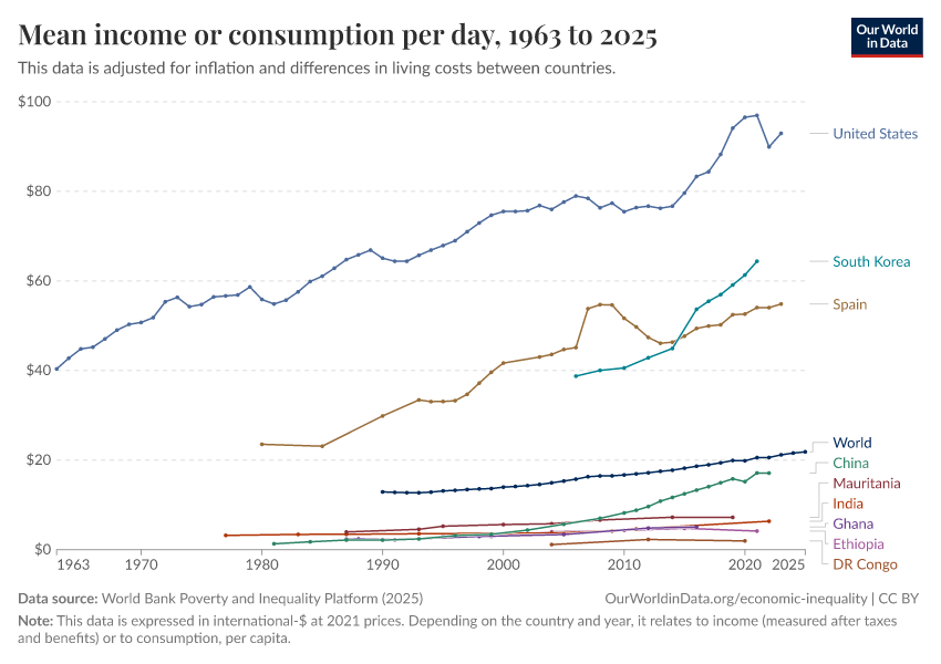 World Bank Poverty and Inequality Platform (2025) – with major processing by Our World in Data. “Mean income or consumption per day – World Bank” [dataset]. World Bank Poverty and Inequality Platform, “World Bank Poverty and Inequality Platform (PIP) 20250930_2021, 20250930_2017” [original data]. Retrieved April 5, 2026 from https://archive.ourworldindata.org/20260402-163007/grapher/daily-mean-income.html (archived on April 2, 2026).