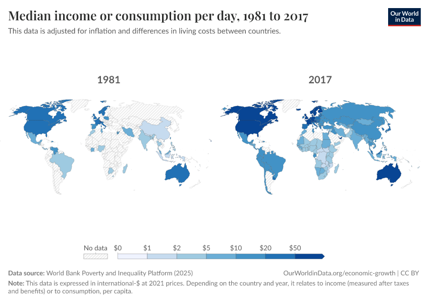 “Data Page: Median income or consumption per day”, part of the following publication: Joe Hasell, Bertha Rohenkohl, Pablo Arriagada, Esteban Ortiz-Ospina, and Max Roser (2022) - “Poverty”. Data adapted from World Bank Poverty and Inequality Platform. Retrieved from https://archive.ourworldindata.org/20260127-114142/grapher/daily-median-income.html [online resource] (archived on January 27, 2026).How to cite this data