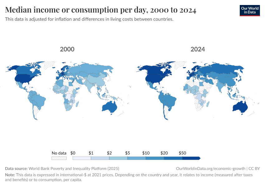 “Data Page: Median income or consumption per day”, part of the following publication: Joe Hasell, Bertha Rohenkohl, Pablo Arriagada, Esteban Ortiz-Ospina, and Max Roser (2022) - “Poverty”. Data adapted from World Bank Poverty and Inequality Platform. Retrieved from https://archive.ourworldindata.org/20251030-150736/grapher/daily-median-income.html [online resource] (archived on October 30, 2025).How to cite this data
