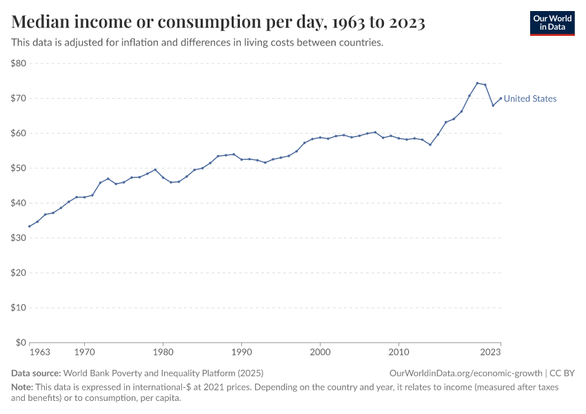 “Data Page: Median income or consumption per day”, part of the following publication: Joe Hasell, Bertha Rohenkohl, Pablo Arriagada, Esteban Ortiz-Ospina, and Max Roser (2022) - “Poverty”. Data adapted from World Bank Poverty and Inequality Platform. Retrieved from https://archive.ourworldindata.org/20251030-150736/grapher/daily-median-income.html [online resource] (archived on October 30, 2025).