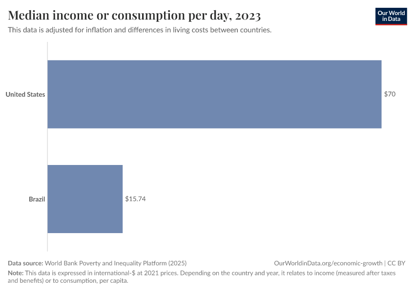 “Data Page: Median income or consumption per day”, part of the following publication: Joe Hasell, Bertha Rohenkohl, Pablo Arriagada, Esteban Ortiz-Ospina, and Max Roser (2022) - “Poverty”. Data adapted from World Bank Poverty and Inequality Platform. Retrieved from https://archive.ourworldindata.org/20260127-114142/grapher/daily-median-income.html [online resource] (archived on January 27, 2026).How to cite this data
