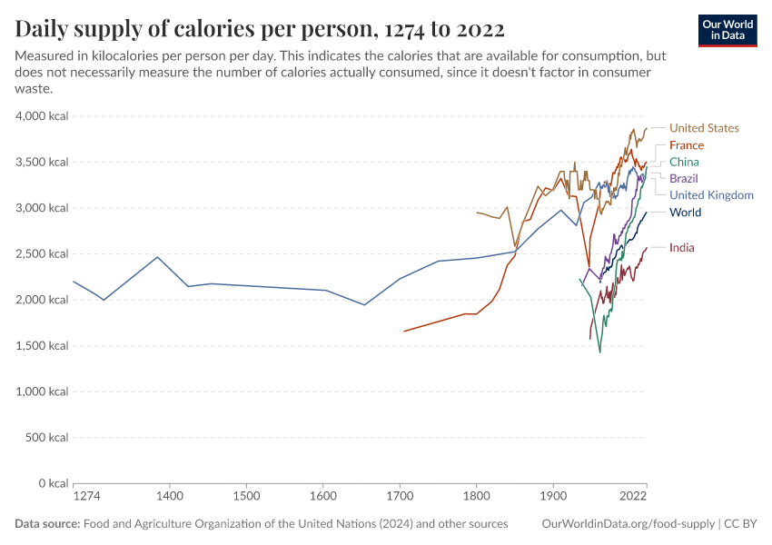 Food and Agriculture Organization of the United Nations (2024); Harris et al. (2015); Floud et al. (2011); Jonsson (1998); Grigg (1995); Fogel (2004); Food and Agriculture Organization of the United Nations (2000); Food and Agriculture Organization of the United Nations (1949); USDA Economic Research Service (ERS) (2015) – with major processing by Our World in Data. “Daily supply of calories per person” [dataset]. Food and Agriculture Organization of the United Nations, “Food Balances: Food Balances (-2013, old methodology and population)”; Food and Agriculture Organization of the United Nations, “Food Balances: Food Balances (2010-)”; Harris et al., “How Many Calories? Food Availability in England and Wales in the Eighteenth and Nineteenth Centuries”; Floud et al., “The Changing Body”; Jonsson, “Changes in food consumption in Iceland, 1770-1940”; Grigg, “The nutritional transition in Western Europe”; Fogel, “The Escape from Hunger and Premature Death”; Food and Agriculture Organization of the United Nations, “The State of Food and Agriculture 2000”; Food and Agriculture Organization of the United Nations, “The State of Food and Agriculture 1949”; USDA Economic Research Service (ERS), “U.S. food supply:  Nutrients and other food components, per capita per day” [original data]. Retrieved January 10, 2026 from https://archive.ourworldindata.org/20251014-163147/grapher/daily-per-capita-caloric-supply.html (archived on October 14, 2025).