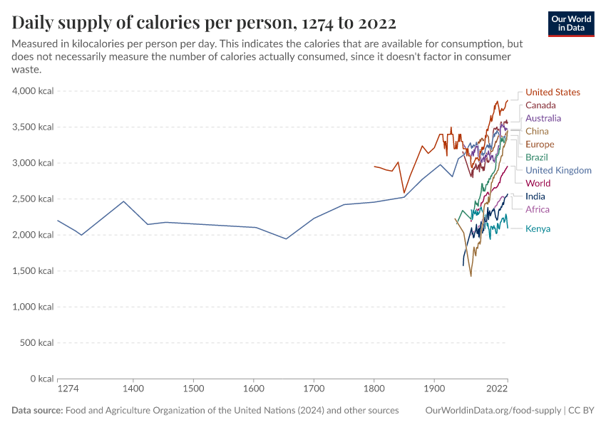 Food and Agriculture Organization of the United Nations (2024); Harris et al. (2015); Floud et al. (2011); Jonsson (1998); Grigg (1995); Fogel (2004); Food and Agriculture Organization of the United Nations (2000); Food and Agriculture Organization of the United Nations (1949); USDA Economic Research Service (ERS) (2015) – with major processing by Our World in Data. “Daily supply of calories per person” [dataset]. Food and Agriculture Organization of the United Nations, “Food Balances: Food Balances (-2013, old methodology and population)”; Food and Agriculture Organization of the United Nations, “Food Balances: Food Balances (2010-)”; Harris et al., “How Many Calories? Food Availability in England and Wales in the Eighteenth and Nineteenth Centuries”; Floud et al., “The Changing Body”; Jonsson, “Changes in food consumption in Iceland, 1770-1940”; Grigg, “The nutritional transition in Western Europe”; Fogel, “The Escape from Hunger and Premature Death”; Food and Agriculture Organization of the United Nations, “The State of Food and Agriculture 2000”; Food and Agriculture Organization of the United Nations, “The State of Food and Agriculture 1949”; USDA Economic Research Service (ERS), “U.S. food supply: Nutrients and other food components, per capita per day” [original data]. Retrieved January 16, 2026 from https://archive.ourworldindata.org/20251014-163147/grapher/daily-per-capita-caloric-supply.html (archived on October 14, 2025).
