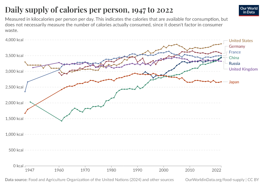 Food and Agriculture Organization of the United Nations (2024); Harris et al. (2015); Floud et al. (2011); Jonsson (1998); Grigg (1995); Fogel (2004); Food and Agriculture Organization of the United Nations (2000); Food and Agriculture Organization of the United Nations (1949); USDA Economic Research Service (ERS) (2015) – with major processing by Our World in Data. “Daily supply of calories per person” [dataset]. Food and Agriculture Organization of the United Nations, “Food Balances: Food Balances (-2013, old methodology and population)”; Food and Agriculture Organization of the United Nations, “Food Balances: Food Balances (2010-)”; Harris et al., “How Many Calories? Food Availability in England and Wales in the Eighteenth and Nineteenth Centuries”; Floud et al., “The Changing Body”; Jonsson, “Changes in food consumption in Iceland, 1770-1940”; Grigg, “The nutritional transition in Western Europe”; Fogel, “The Escape from Hunger and Premature Death”; Food and Agriculture Organization of the United Nations, “The State of Food and Agriculture 2000”; Food and Agriculture Organization of the United Nations, “The State of Food and Agriculture 1949”; USDA Economic Research Service (ERS), “U.S. food supply: Nutrients and other food components, per capita per day” [original data]. Retrieved December 19, 2025 from https://archive.ourworldindata.org/20251014-163147/grapher/daily-per-capita-caloric-supply.html (archived on October 14, 2025).