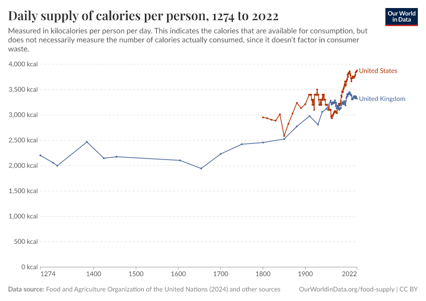 Food and Agriculture Organization of the United Nations (2024); Harris et al. (2015); Floud et al. (2011); Jonsson (1998); Grigg (1995); Fogel (2004); Food and Agriculture Organization of the United Nations (2000); Food and Agriculture Organization of the United Nations (1949); USDA Economic Research Service (ERS) (2015) – with major processing by Our World in Data. “Daily supply of calories per person” [dataset]. Food and Agriculture Organization of the United Nations, “Food Balances: Food Balances (-2013, old methodology and population)”; Food and Agriculture Organization of the United Nations, “Food Balances: Food Balances (2010-)”; Harris et al., “How Many Calories? Food Availability in England and Wales in the Eighteenth and Nineteenth Centuries”; Floud et al., “The Changing Body”; Jonsson, “Changes in food consumption in Iceland, 1770-1940”; Grigg, “The nutritional transition in Western Europe”; Fogel, “The Escape from Hunger and Premature Death”; Food and Agriculture Organization of the United Nations, “The State of Food and Agriculture 2000”; Food and Agriculture Organization of the United Nations, “The State of Food and Agriculture 1949”; USDA Economic Research Service (ERS), “U.S. food supply: Nutrients and other food components, per capita per day” [original data]. Retrieved November 15, 2025 from https://archive.ourworldindata.org/20251014-163147/grapher/daily-per-capita-caloric-supply.html (archived on October 14, 2025).