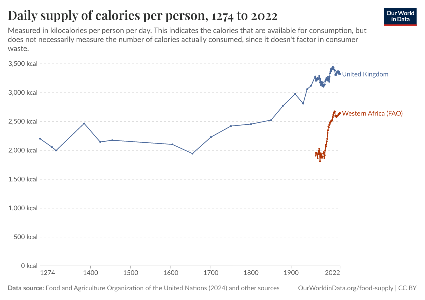 “Data Page: Daily supply of calories per person”, part of the following publication: Max Roser, Hannah Ritchie, and Pablo Rosado (2013) - “Food Supply”. Data adapted from Food and Agriculture Organization of the United Nations, Harris et al., Floud et al., Jonsson, Grigg, Fogel, USDA Economic Research Service (ERS). Retrieved from https://archive.ourworldindata.org/20260116-144923/grapher/daily-per-capita-caloric-supply.html [online resource] (archived on January 16, 2026).