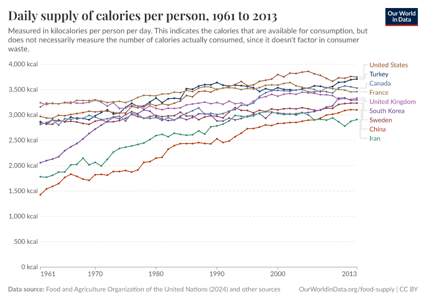 Food and Agriculture Organization of the United Nations (2024); Harris et al. (2015); Floud et al. (2011); Jonsson (1998); Grigg (1995); Fogel (2004); Food and Agriculture Organization of the United Nations (2000); Food and Agriculture Organization of the United Nations (1949); USDA Economic Research Service (ERS) (2015) – with major processing by Our World in Data. “Daily supply of calories per person” [dataset]. Food and Agriculture Organization of the United Nations, “Food Balances: Food Balances (-2013, old methodology and population)”; Food and Agriculture Organization of the United Nations, “Food Balances: Food Balances (2010-)”; Harris et al., “How Many Calories? Food Availability in England and Wales in the Eighteenth and Nineteenth Centuries”; Floud et al., “The Changing Body”; Jonsson, “Changes in food consumption in Iceland, 1770-1940”; Grigg, “The nutritional transition in Western Europe”; Fogel, “The Escape from Hunger and Premature Death”; Food and Agriculture Organization of the United Nations, “The State of Food and Agriculture 2000”; Food and Agriculture Organization of the United Nations, “The State of Food and Agriculture 1949”; USDA Economic Research Service (ERS), “U.S. food supply:  Nutrients and other food components, per capita per day” [original data]. Retrieved December 13, 2025 from https://archive.ourworldindata.org/20251014-163147/grapher/daily-per-capita-caloric-supply.html (archived on October 14, 2025).