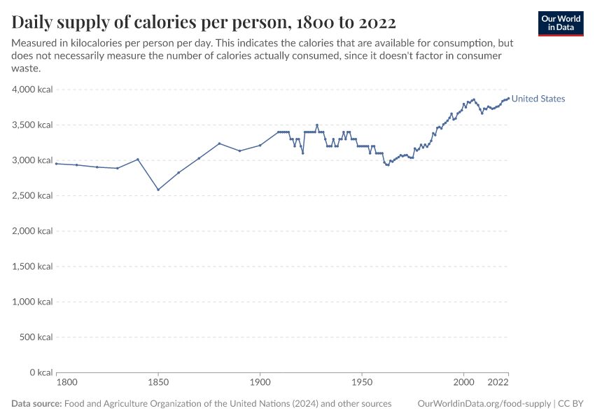 Food and Agriculture Organization of the United Nations (2024); Harris et al. (2015); Floud et al. (2011); Jonsson (1998); Grigg (1995); Fogel (2004); Food and Agriculture Organization of the United Nations (2000); Food and Agriculture Organization of the United Nations (1949); USDA Economic Research Service (ERS) (2015) – with major processing by Our World in Data. “Daily supply of calories per person” [dataset]. Food and Agriculture Organization of the United Nations, “Food Balances: Food Balances (-2013, old methodology and population)”; Food and Agriculture Organization of the United Nations, “Food Balances: Food Balances (2010-)”; Harris et al., “How Many Calories? Food Availability in England and Wales in the Eighteenth and Nineteenth Centuries”; Floud et al., “The Changing Body”; Jonsson, “Changes in food consumption in Iceland, 1770-1940”; Grigg, “The nutritional transition in Western Europe”; Fogel, “The Escape from Hunger and Premature Death”; Food and Agriculture Organization of the United Nations, “The State of Food and Agriculture 2000”; Food and Agriculture Organization of the United Nations, “The State of Food and Agriculture 1949”; USDA Economic Research Service (ERS), “U.S. food supply: Nutrients and other food components, per capita per day” [original data]. Retrieved December 17, 2025 from https://archive.ourworldindata.org/20251014-163147/grapher/daily-per-capita-caloric-supply.html (archived on October 14, 2025).