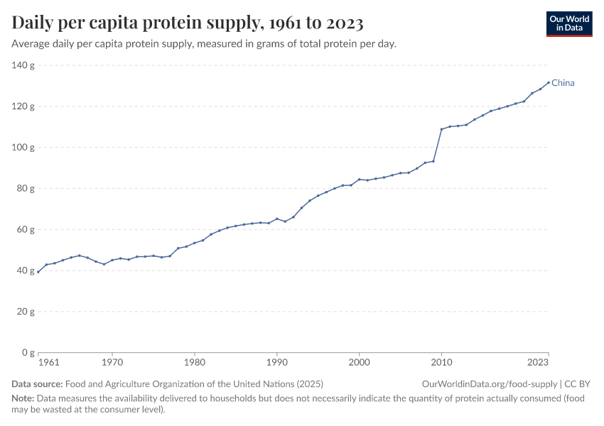 “Data Page: Total daily supply of protein per person”. Our World in Data (2026). Data adapted from Food and Agriculture Organization of the United Nations. Retrieved from https://archive.ourworldindata.org/20260326-143922/grapher/daily-per-capita-protein-supply.html [online resource] (archived on March 26, 2026).How to cite this data