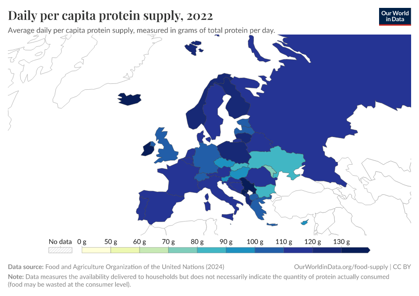 “Data Page: Total daily supply of protein per person”. Our World in Data (2025). Data adapted from Food and Agriculture Organization of the United Nations. Retrieved from https://archive.ourworldindata.org/20251128-120039/grapher/daily-per-capita-protein-supply.html [online resource] (archived on November 28, 2025).How to cite this data