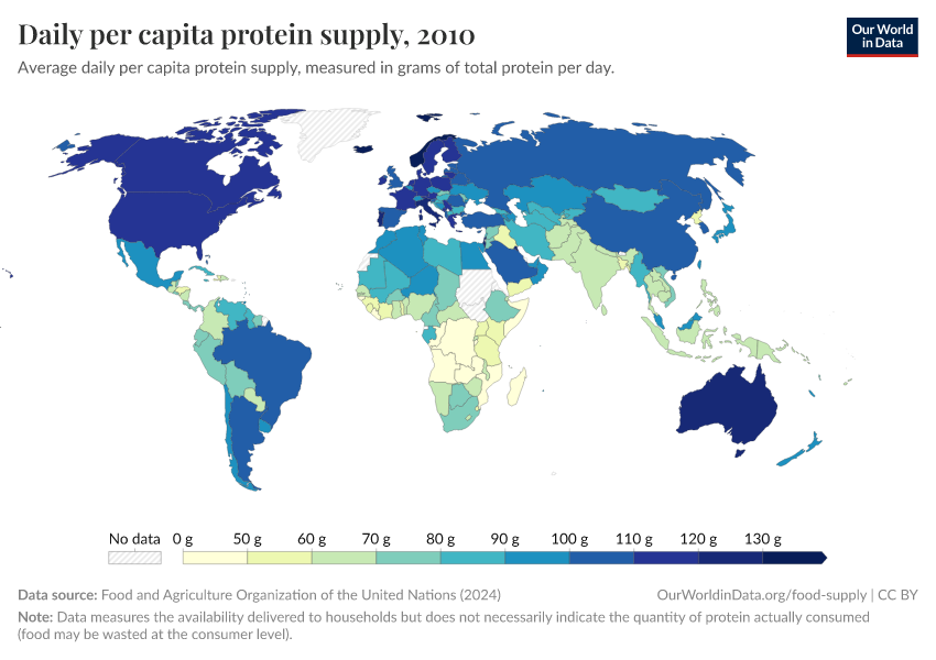 “Data Page: Total daily supply of protein per person”. Our World in Data (2025). Data adapted from Food and Agriculture Organization of the United Nations. Retrieved from https://archive.ourworldindata.org/20251128-120039/grapher/daily-per-capita-protein-supply.html [online resource] (archived on November 28, 2025).How to cite this data