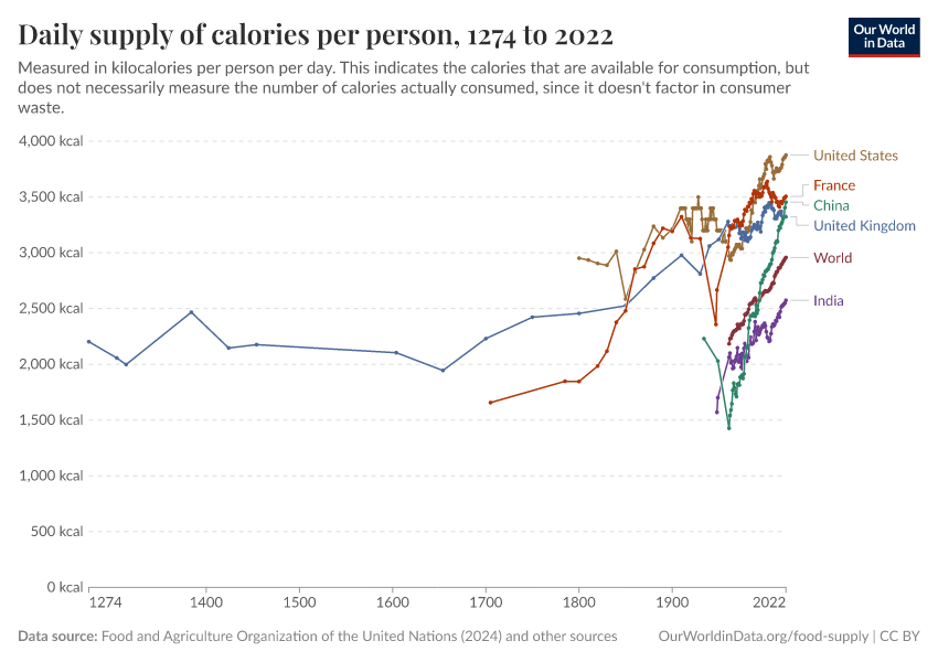 Food and Agriculture Organization of the United Nations (2024); Harris et al. (2015); Floud et al. (2011); Jonsson (1998); Grigg (1995); Fogel (2004); Food and Agriculture Organization of the United Nations (2000); Food and Agriculture Organization of the United Nations (1949); USDA Economic Research Service (ERS) (2015) – with major processing by Our World in Data. “Daily supply of calories per person” [dataset]. Food and Agriculture Organization of the United Nations, “Food Balances: Food Balances (-2013, old methodology and population)”; Food and Agriculture Organization of the United Nations, “Food Balances: Food Balances (2010-)”; Harris et al., “How Many Calories? Food Availability in England and Wales in the Eighteenth and Nineteenth Centuries”; Floud et al., “The Changing Body”; Jonsson, “Changes in food consumption in Iceland, 1770-1940”; Grigg, “The nutritional transition in Western Europe”; Fogel, “The Escape from Hunger and Premature Death”; Food and Agriculture Organization of the United Nations, “The State of Food and Agriculture 2000”; Food and Agriculture Organization of the United Nations, “The State of Food and Agriculture 1949”; USDA Economic Research Service (ERS), “U.S. food supply: Nutrients and other food components, per capita per day” [original data]. Retrieved December 9, 2025 from https://archive.ourworldindata.org/20251014-163147/grapher/daily-per-capita-caloric-supply.html (archived on October 14, 2025).