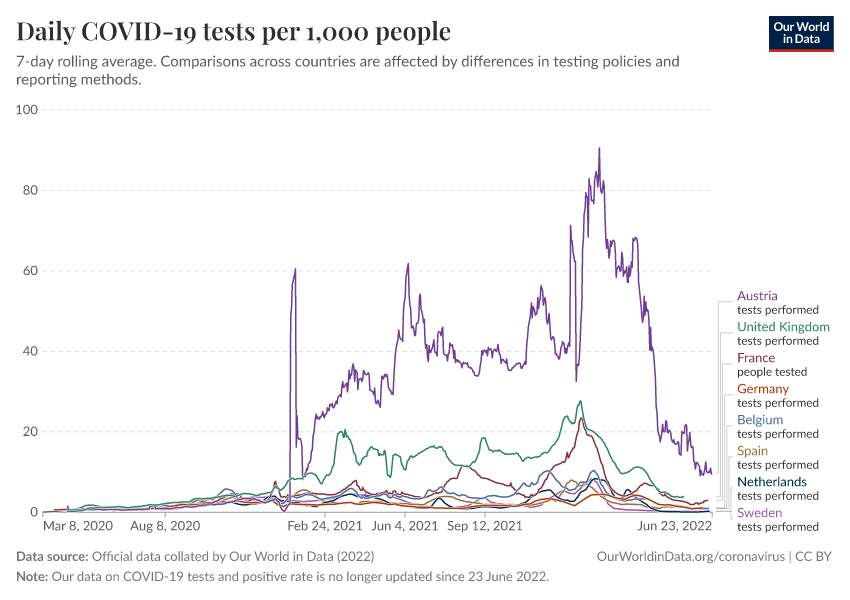 Official data collated by Our World in Data (2022) – with major processing by Our World in Data. “Daily COVID-19 tests per 1,000 people” [dataset]. Official data collated by Our World in Data, “COVID-19, testing” [original data]. Retrieved January 28, 2026 from https://archive.ourworldindata.org/20250909-093708/grapher/daily-tests-per-thousand-people-smoothed-7-day.html (archived on September 9, 2025).