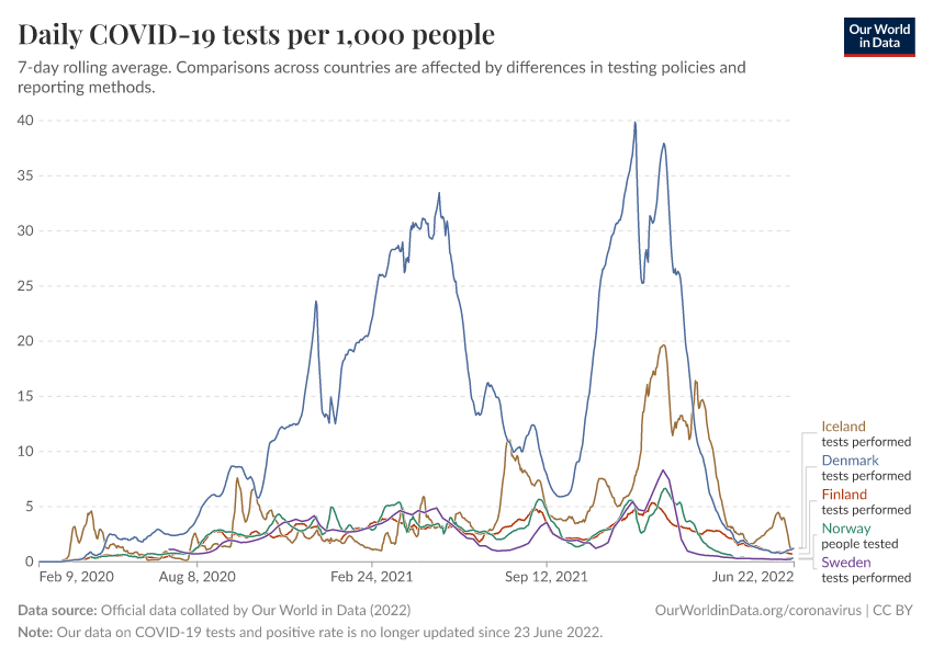 Official data collated by Our World in Data (2022) – with major processing by Our World in Data. “Daily COVID-19 tests per 1,000 people” [dataset]. Official data collated by Our World in Data, “COVID-19, testing” [original data]. Retrieved December 20, 2025 from https://archive.ourworldindata.org/20250909-093708/grapher/daily-tests-per-thousand-people-smoothed-7-day.html (archived on September 9, 2025).