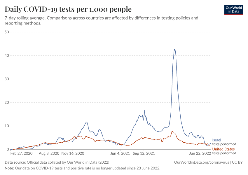 Official data collated by Our World in Data (2022) – with major processing by Our World in Data. “Daily COVID-19 tests per 1,000 people” [dataset]. Official data collated by Our World in Data, “COVID-19, testing” [original data]. Retrieved January 28, 2026 from https://archive.ourworldindata.org/20250909-093708/grapher/daily-tests-per-thousand-people-smoothed-7-day.html (archived on September 9, 2025).