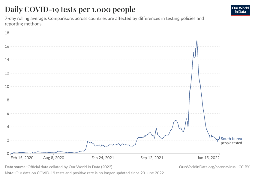 Official data collated by Our World in Data (2022) – with major processing by Our World in Data. “Daily COVID-19 tests per 1,000 people” [dataset]. Official data collated by Our World in Data, “COVID-19, testing” [original data]. Retrieved January 1, 2026 from https://archive.ourworldindata.org/20250909-093708/grapher/daily-tests-per-thousand-people-smoothed-7-day.html (archived on September 9, 2025).