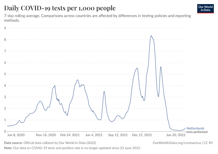 Official data collated by Our World in Data (2022) – with major processing by Our World in Data. “Daily COVID-19 tests per 1,000 people” [dataset]. Official data collated by Our World in Data, “COVID-19, testing” [original data]. Retrieved March 8, 2026 from https://archive.ourworldindata.org/20260304-094028/grapher/daily-tests-per-thousand-people-smoothed-7-day.html (archived on March 4, 2026).