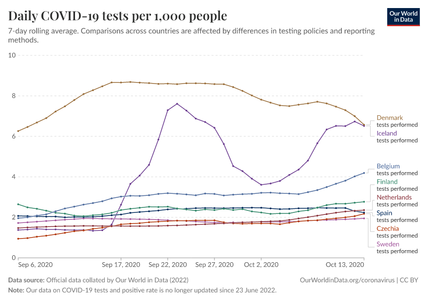 Official data collated by Our World in Data (2022) – with major processing by Our World in Data. “Daily COVID-19 tests per 1,000 people” [dataset]. Official data collated by Our World in Data, “COVID-19, testing” [original data]. Retrieved December 15, 2025 from https://archive.ourworldindata.org/20250909-093708/grapher/daily-tests-per-thousand-people-smoothed-7-day.html (archived on September 9, 2025).