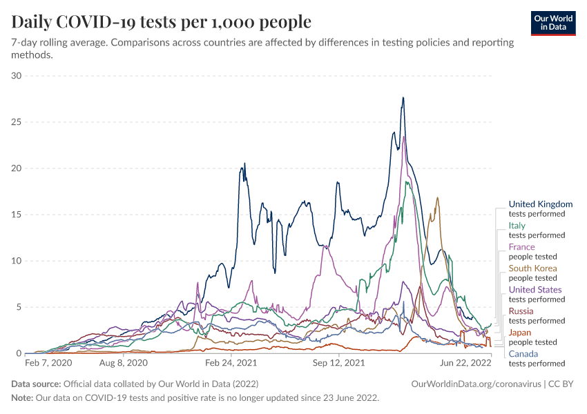 Official data collated by Our World in Data (2022) – with major processing by Our World in Data. “Daily COVID-19 tests per 1,000 people” [dataset]. Official data collated by Our World in Data, “COVID-19, testing” [original data]. Retrieved December 8, 2025 from https://archive.ourworldindata.org/20250909-093708/grapher/daily-tests-per-thousand-people-smoothed-7-day.html (archived on September 9, 2025).