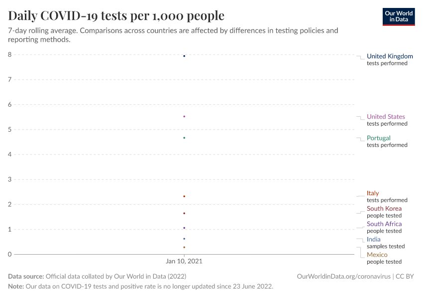 Official data collated by Our World in Data (2022) – with major processing by Our World in Data. “Daily COVID-19 tests per 1,000 people” [dataset]. Official data collated by Our World in Data, “COVID-19, testing” [original data]. Retrieved December 27, 2025 from https://archive.ourworldindata.org/20250909-093708/grapher/daily-tests-per-thousand-people-smoothed-7-day.html (archived on September 9, 2025).