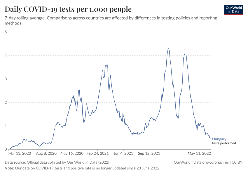 Official data collated by Our World in Data (2022) – with major processing by Our World in Data. “Daily COVID-19 tests per 1,000 people” [dataset]. Official data collated by Our World in Data, “COVID-19, testing” [original data]. Retrieved March 8, 2026 from https://archive.ourworldindata.org/20260304-094028/grapher/daily-tests-per-thousand-people-smoothed-7-day.html (archived on March 4, 2026).