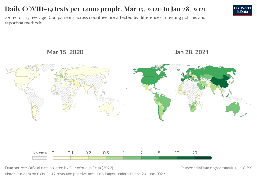 Official data collated by Our World in Data (2022) – with major processing by Our World in Data. “Daily COVID-19 tests per 1,000 people” [dataset]. Official data collated by Our World in Data, “COVID-19, testing” [original data]. Retrieved December 19, 2025 from https://archive.ourworldindata.org/20250909-093708/grapher/daily-tests-per-thousand-people-smoothed-7-day.html (archived on September 9, 2025).