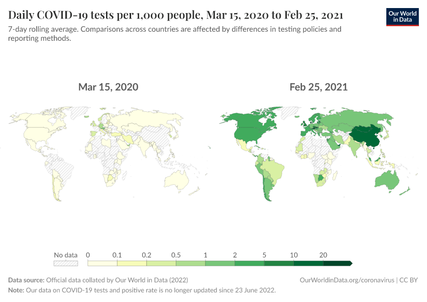Official data collated by Our World in Data (2022) – with major processing by Our World in Data. “Daily COVID-19 tests per 1,000 people” [dataset]. Official data collated by Our World in Data, “COVID-19, testing” [original data]. Retrieved December 19, 2025 from https://archive.ourworldindata.org/20250909-093708/grapher/daily-tests-per-thousand-people-smoothed-7-day.html (archived on September 9, 2025).