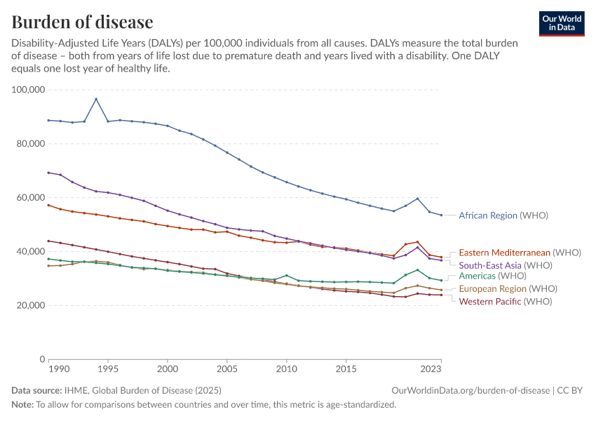 IHME, Global Burden of Disease (2025) – with major processing by Our World in Data. “Burden of disease” [dataset]. IHME, Global Burden of Disease, “Global Burden of Disease - DALYs” [original data]. Retrieved February 27, 2026 from https://archive.ourworldindata.org/20260211-174736/grapher/dalys-rate-from-all-causes.html (archived on February 11, 2026).