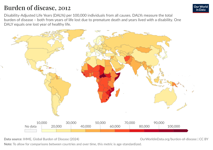 IHME, Global Burden of Disease (2024) – with minor processing by Our World in Data. “Burden of disease” [dataset]. IHME, Global Burden of Disease, “Global Burden of Disease - Deaths and DALYs” [original data]. Retrieved January 8, 2026 from https://archive.ourworldindata.org/20250909-093708/grapher/dalys-rate-from-all-causes.html (archived on September 9, 2025).