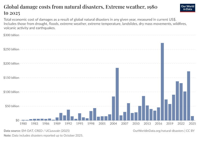 EM-DAT, CRED / UCLouvain (2025) – with major processing by Our World in Data. “Global damage costs from natural disasters – EM-DAT” [dataset]. EM-DAT, “The International Disasters Database” [original data]. Retrieved January 16, 2026 from https://archive.ourworldindata.org/20260112-111535/grapher/damage-costs-from-natural-disasters.html (archived on January 12, 2026).