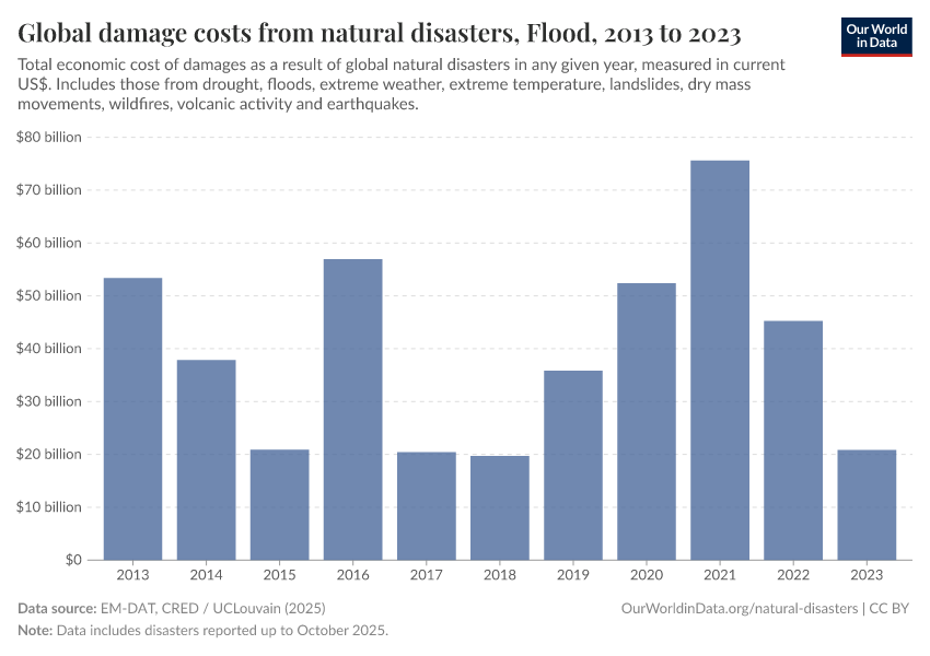 “Data Page: Global damage costs from natural disasters”, part of the following publication: Hannah Ritchie, Pablo Rosado, and Max Roser (2022) - “Natural Disasters”. Data adapted from EM-DAT, CRED / UCLouvain. Retrieved from https://archive.ourworldindata.org/20251126-143026/grapher/damage-costs-from-natural-disasters.html [online resource] (archived on November 26, 2025).