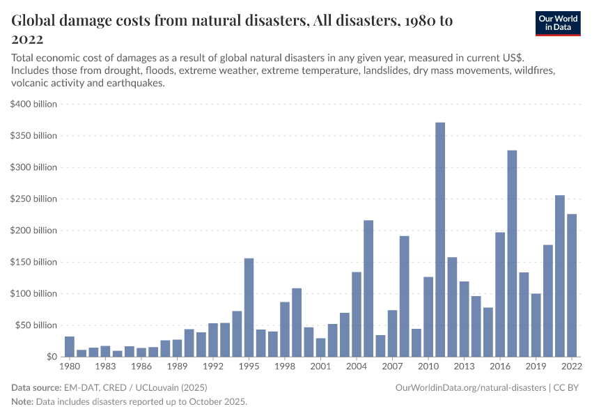 EM-DAT, CRED / UCLouvain (2025) – with major processing by Our World in Data. “Global damage costs from natural disasters – EM-DAT” [dataset]. EM-DAT, CRED / UCLouvain, “Natural disasters” [original data]. Retrieved December 5, 2025 from https://archive.ourworldindata.org/20251126-143026/grapher/damage-costs-from-natural-disasters.html (archived on November 26, 2025).