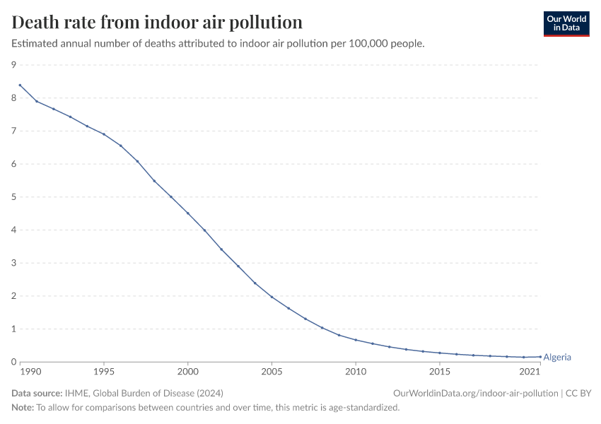 “Data Page: Death rate from indoor air pollution”, part of the following publication: Esteban Ortiz-Ospina and Max Roser (2016) - “Global Health”. Data adapted from IHME, Global Burden of Disease. Retrieved from https://archive.ourworldindata.org/20250909-093708/grapher/death-rate-by-source-from-indoor-air-pollution.html [online resource] (archived on September 9, 2025).