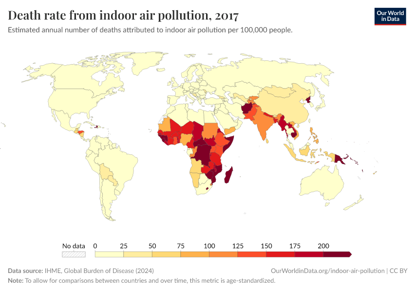 IHME, Global Burden of Disease (2024) – with minor processing by Our World in Data. “Death rate from indoor air pollution” [dataset]. IHME, Global Burden of Disease, “Global Burden of Disease - Risk Factors” [original data]. Retrieved December 7, 2025 from https://archive.ourworldindata.org/20250909-093708/grapher/death-rate-by-source-from-indoor-air-pollution.html (archived on September 9, 2025).
