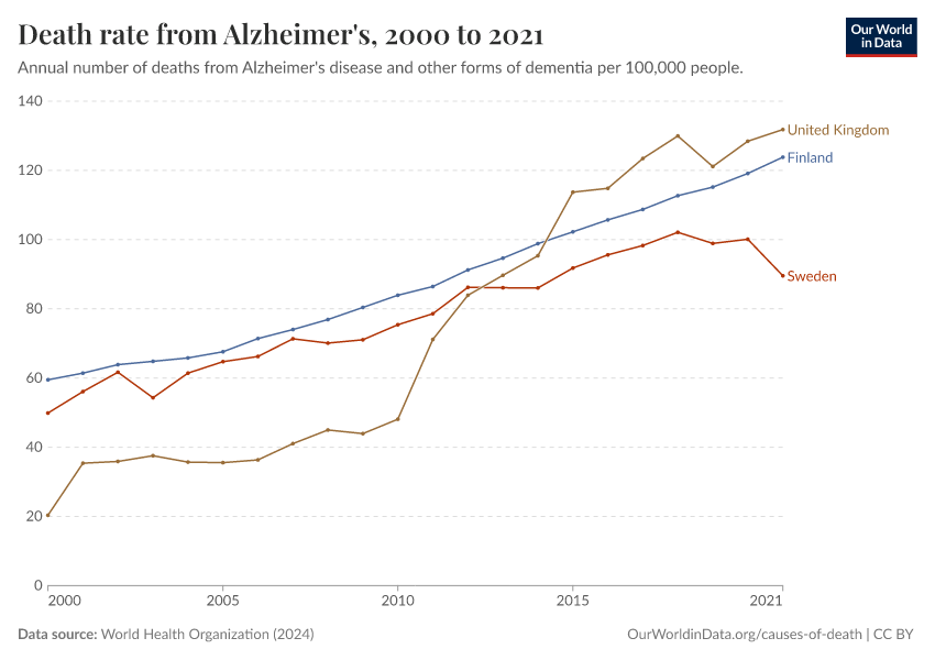 World Health Organization (2024) – with major processing by Our World in Data. “Death rate from Alzheimer's” [dataset]. World Health Organization, “Global Health Estimates” [original data]. Retrieved April 2, 2026 from https://archive.ourworldindata.org/20260325-171315/grapher/death-rate-from-alzheimers-other-dementias-ghe.html (archived on March 25, 2026).Download