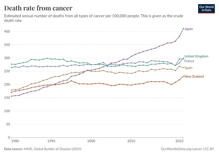IHME, Global Burden of Disease (2025) – with major processing by Our World in Data. “Death rate from cancer – IHME” [dataset]. IHME, Global Burden of Disease, “Global Burden of Disease - Deaths” [original data]. Retrieved March 31, 2026 from https://archive.ourworldindata.org/20260323-161325/grapher/death-rate-from-cancer-gbd.html (archived on March 23, 2026).