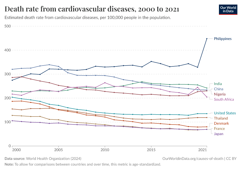 “Data Page: Death rate from cardiovascular diseases”, part of the following publication: Esteban Ortiz-Ospina and Max Roser (2016) - “Global Health”. Data adapted from World Health Organization. Retrieved from https://archive.ourworldindata.org/20250909-093708/grapher/death-rate-from-cardiovascular-disease-age-standardized-ghe.html [online resource] (archived on September 9, 2025).How to cite this data