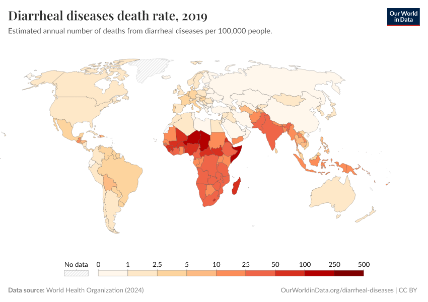World Health Organization (2024) – with major processing by Our World in Data. “Diarrheal diseases death rate” [dataset]. World Health Organization, “Global Health Estimates” [original data]. Retrieved December 11, 2025 from https://archive.ourworldindata.org/20250909-093708/grapher/death-rate-from-diarrheal-diseases-who.html (archived on September 9, 2025).