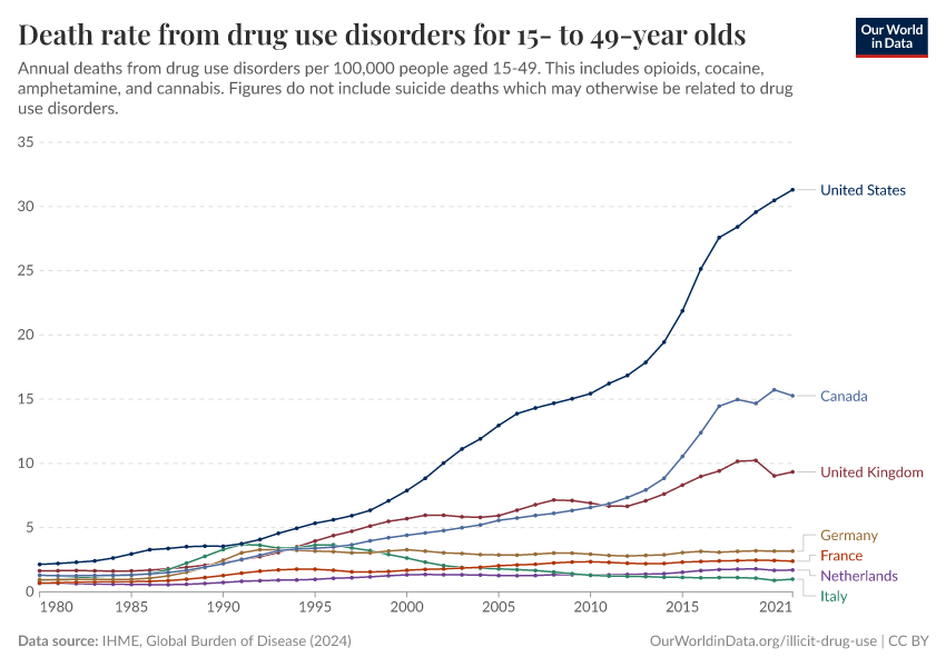 IHME, Global Burden of Disease (2024) – with minor processing by Our World in Data. “Death rate from drug use disorders for 15- to 49-year olds” [dataset]. IHME, Global Burden of Disease, “Global Burden of Disease - Deaths and DALYs” [original data]. Retrieved December 18, 2025 from https://archive.ourworldindata.org/20250909-093708/grapher/death-rate-from-drug-use-disorders-for-15--to-49-year-olds.html (archived on September 9, 2025).