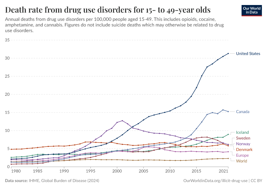IHME, Global Burden of Disease (2024) – with minor processing by Our World in Data. “Death rate from drug use disorders for 15- to 49-year olds” [dataset]. IHME, Global Burden of Disease, “Global Burden of Disease - Deaths and DALYs” [original data]. Retrieved December 7, 2025 from https://archive.ourworldindata.org/20250909-093708/grapher/death-rate-from-drug-use-disorders-for-15--to-49-year-olds.html (archived on September 9, 2025).